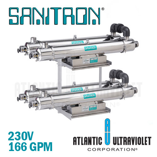 | Sanitron® Modell S25,000C [1 580 l/m] Visad med kopplingsrör, trådlös digital Guardian™ ultraviolett övervakare, solenoidventil, flödesbegränsare, rör med skarvkopplingar, och avstängningsventiler. |